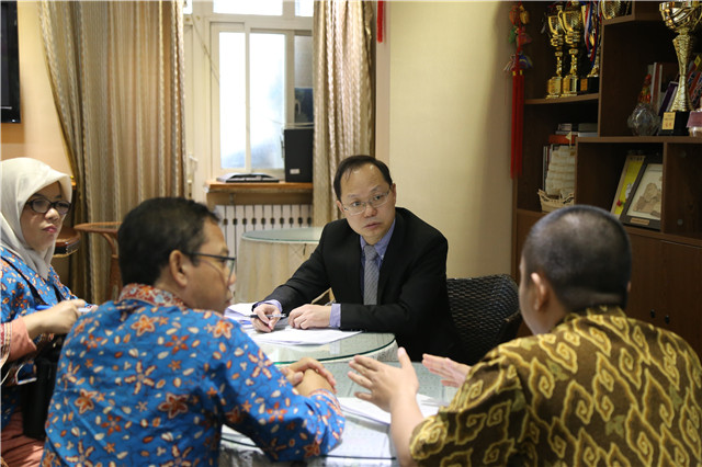 墨邱布安南大学教务处HADRI MULYA DAHLIAR副主任对汪滢的介绍表示感谢,此行代表团包括通信科学学院、电子工程学院、计算机学院、机械工程学院及管理学院各位院领导和讲师。通过与ob真人竞猜相应学院负责人的探讨,将进一步扩展本科双学位的专业领域,促成硕士“1+1”双学位的可能性以及探讨了教学管理模式。