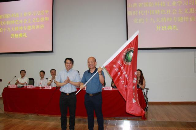 ob真人竞猜管理与经济学院副院长颜志军代表学院为培训班授旗,学员代表山西北方机械制造有限责任公司党委书记张为民接受班旗,宣告此次培训班正式成立。