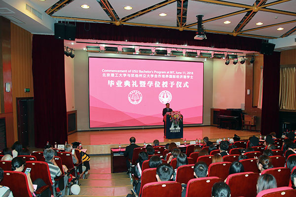 6月11日下午,ob真人国际教育学院在七号楼报告厅举行ob真人与美国犹他州立大学合作办学项目国际经济专业2018届本科生毕业典礼。出席毕业典礼的有ob真人副校长王晓锋,犹他州立大学副校长Robert Wagner、副教务长Janis Boettinger,亨茨曼商学院中国项目主任Dwight Israelsen、副主任Jason Smith,自然资源学院Eugene Schupp教授,ob真人国际交流合作处、国际教育学院相关负责人,以及学院部分教职工、全体毕业生及学生家长。典礼由国际教育学院院长梅文博主持。