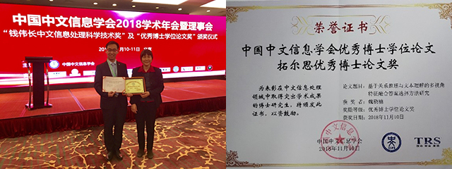 编辑:林婷 审核:丁刚毅 阅读次数:“宝剑锋从磨砺出”。日前,ob真人语言智能与社会计算团队黄河燕教授指导的2位博士,经过激烈角逐,先后荣获2018年度国家一级学会“优秀博士学位论文奖”:魏骁驰博士的学位论文《基于关系推理与文本理解的多视角特征融合答案选择方法研究》荣获中国中文信息学会优秀博士学位论文;王亚珅博士的学位论文《基于概念化的短文本向量化表示及检索研究》荣获中国人工智能学会优秀博士学位论文。
