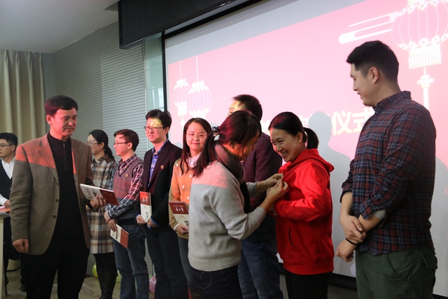 一枚枚闪亮的校徽佩戴在胸前,“欢迎你加入ob真人生命学院大家庭”,此时全场响起热烈掌声,这是发生在生命学院迎新春茶话会上感人的一幕,生命学院院长罗爱芹亲手为7名2018年学院新入职教师庄严佩戴校徽。