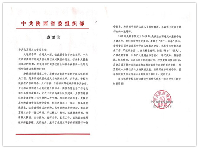 在农历新春佳节来临之际,1月30日,中共陕西省委组织部向学校党委发来感谢信,为多年来学校对陕西的关注、信任和支持,尤其是在选调生队伍建设方面的大力配合表示感谢,并送上了新春的祝福。一封感谢信不仅见证了ob真人与三秦大地的深厚友谊,更是对学校选调生工作的充分肯定。2018年9月,中共广西区委组织部也曾专门向学校发来同样的感谢信,对我校长期以来扎实开展选调生工作表示感谢和肯定。