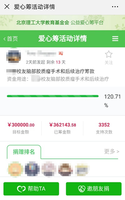 “人生总有低谷,祝愿你早日战胜病魔,拥有自己理想的生活!”“加油,桃花开了,希望你每年都能看到美丽的桃花。”“虽然不认识,但应该在一层楼学习了两年。师姐加油啊!”在平台项目下,不少捐赠者留下了简短而又感人的祝福语,鼓励这位花样年华的同袍与病魔积极抗争,短短8小时就完成了筹款目标。截至发稿时,该项目已有3353人参与,362243.58元善款汇入捐赠账户,汇成一股爱的织流,实现120.71%的募捐效果。