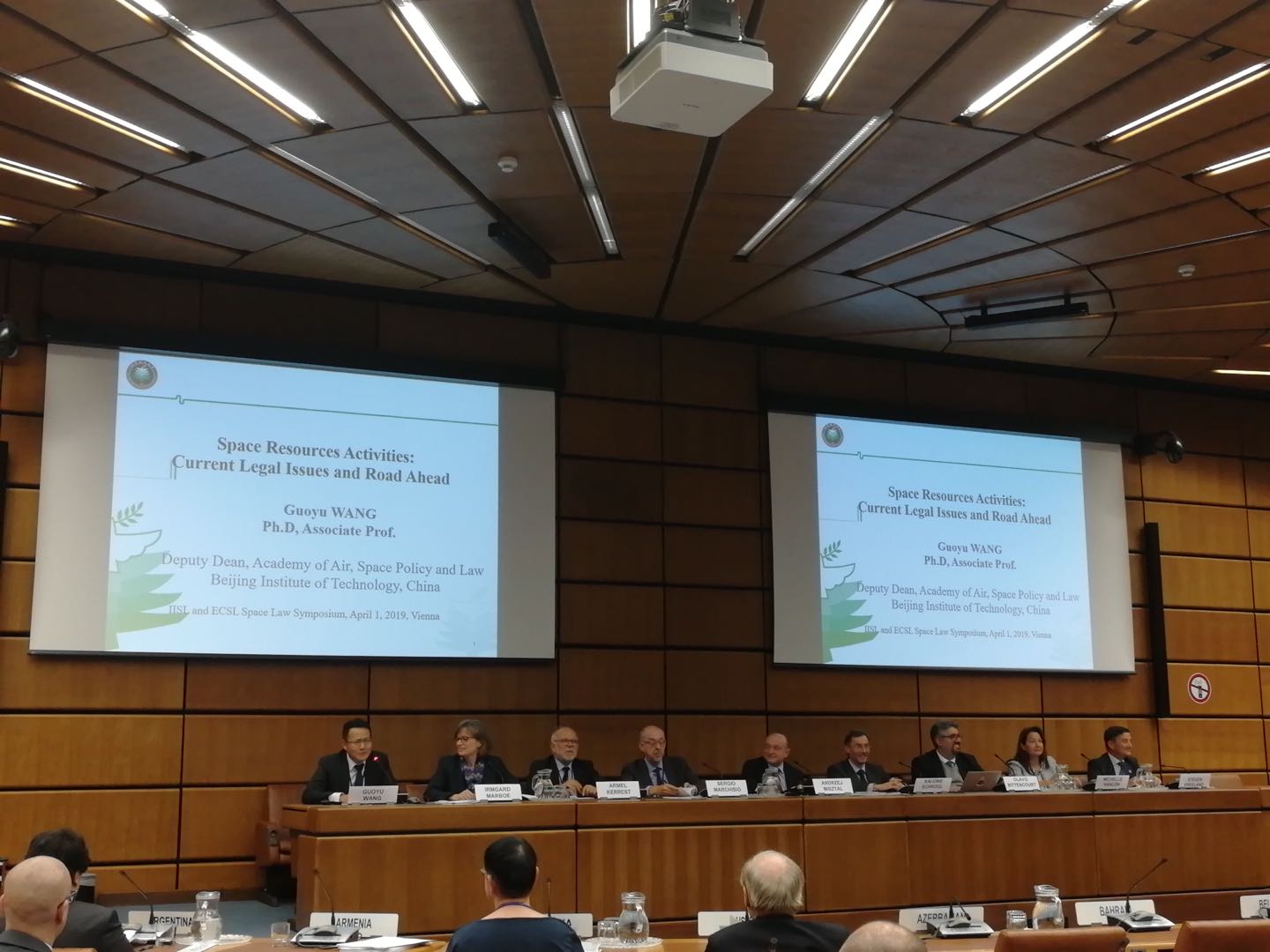 此外,鉴于2019年是《月球协定》制定通过的四十周年,4月1日,国际空间法学会和欧洲空间法中心在法律小组会议主会场联合主办了题为“月球协定:温故而知新”的研讨会,目的是增强空间法学界与各国代表团的互动交流,推动外空资源开发法律研究及国际法治进程。受会议组织方的邀请,王国语做了题为“外空资源活动:现有法律问题及进路”的英文报告,分析了外空资源活动在实然法和应然法角度面临的六个问题,并着重分析了外空活动中的人类共同遗产原则。研讨会由国际空间法学会主席、欧洲空间法中心主任和联合国外空委法律小组委员会主席联合主持,由联合国外空司提供同声传译服务。这是为王国语第二次受邀参加法律小组届会期间举行的由国际空间法学会和欧洲空间法中心组织的空间法研讨会。