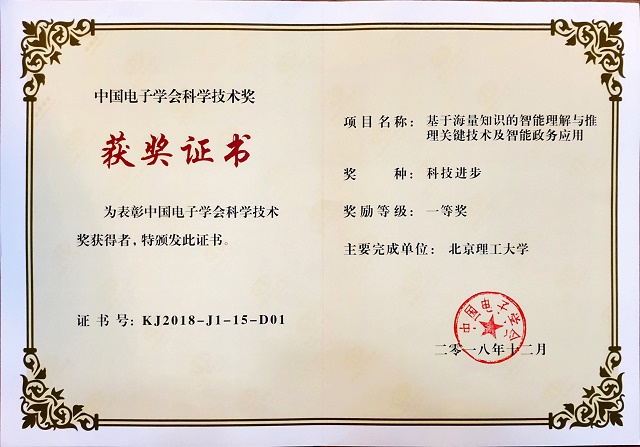 根据《中国电子学会科学技术奖管理办法》该获奖于2018年12月揭晓。本项目由ob真人竞猜、杭州中软安人网络通信股份有限公司、北京大学和复旦大学组成的科研团队在国家863计划、973计划等项目支持下,历经九年的产学研用联合攻关,在自然语言立体理解、一体化实体识别与关系抽取、多视角特征融合答案选择、语义相似度计算模型和多领域知识图谱自动构建方面取得了重要技术突破,研制了高效精准的智能政务服务机器人。