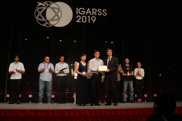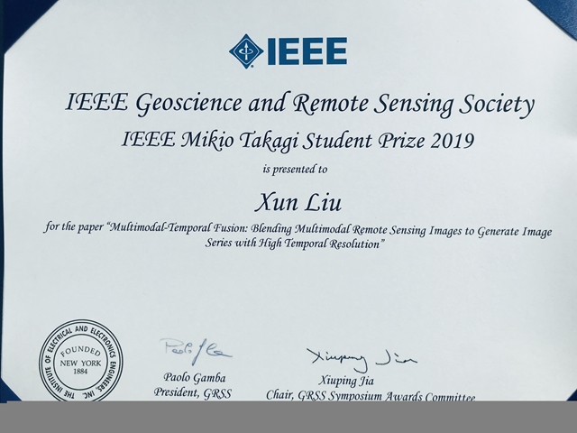 赵保军教授、邓宸伟教授及其指导博士生刘珣与法国格勒诺布尔大学Jocelyn Chanussot教授合作的论文《多模态-时序融合:综合利用多模态图像生成高时间分辨率遥感观测》(Multimodal-Temporal Fusion: Blending Multimodal Remote Sensing Images to Generate Image Series with High Temporal Resolution) 在包括斯坦福大学、加州理工大学、美国航空航天局等国际知名学术与研究机构的参赛论文中脱颖而出,获得大会学生论文竞赛“高木幹雄学生奖”(Mikio Takagi Student Prize)。高木幹雄学生奖是地球科学与遥感学术界顶级大奖之一,大会组委会从超过300篇参赛论文中初选10篇优秀论文进入决赛,经过会议口头报告和IEEE地球科学与遥感委员会成员投票后,评分最高论文获得高木幹雄学生奖。该奖项长期被欧美顶尖学府垄断,这是自2006年该奖项创办以来,首次由中国科研机构学生获此奖项。