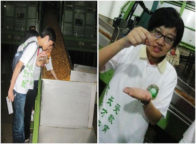 随后,我们在生产部负责人的带领下走进了生产车间,首先我们参观了卷烟的制丝(原料加工)的一个过程,这是卷烟生产从烟叶烘烤到复烤之后,在工业制造过程中的第一步,主要包括备料、回潮、贮叶、切丝、烘丝、叶丝梗丝混合、加香、加料、贮丝等工序。其工艺任务是将各种烟叶制成配比均匀、纯净无杂质,宽度、水分、温度均符合各等级卷烟工艺要求的烟丝。