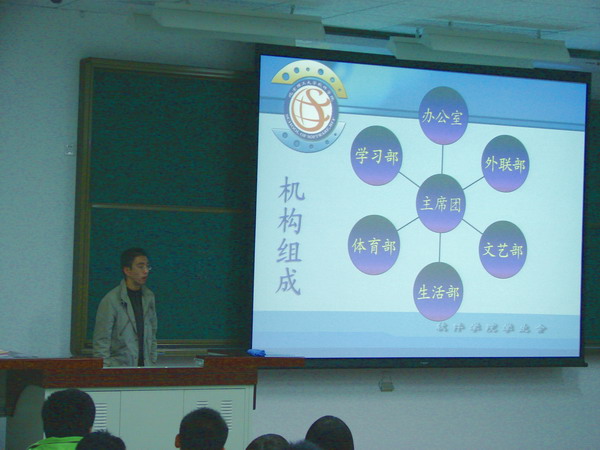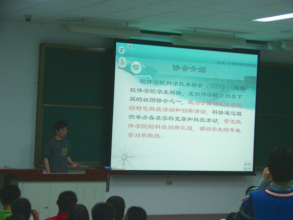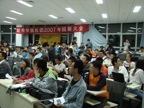 2007年10月11日晚,在良乡校区理科教学楼103室,软件学院2007年度社团招新大会隆重举行。院分团委、学生会以及DV协会等6个学生社团依次闪亮登场,为2007级本科生作了精彩纷呈的社团展示,吸引了大批同学的加入,为我院良乡校区的学生社团工作打下了一个良好的开端和基础。