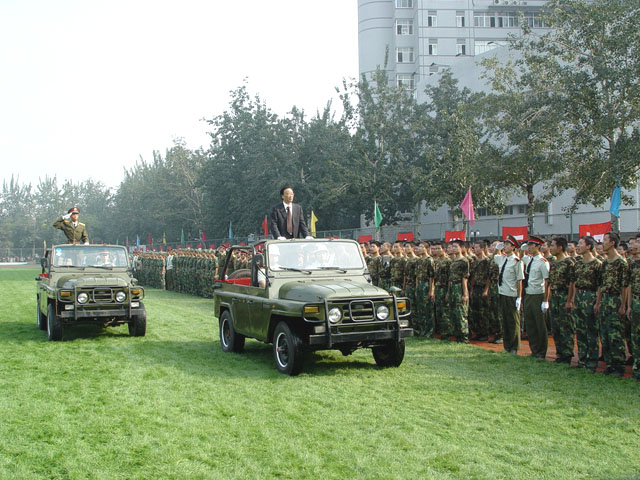 校长匡镜明和承担军训任务的部队首长共同检阅2004级军训旅。