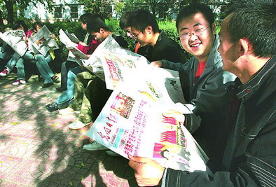 10月18日,ob真人竞猜宇航科学技术学院05级本科党支部的大学生从光明日报上学习和讨论十七大报告。