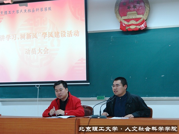 为了加强学风建设,提高人才培养质量,营造浓厚的学习、学术氛围,培养具有创新精神和创新能力的高素质人才,迎接下半年的本科教学评估工作,人文社会科学学院将从4月中旬起,用两个月的时间在全体学生中开展以“讲学习,树新风”为主题的学风建设教育系列活动。4月9日下午5:40,学风建设动员会在1号教学楼110教室举行,学院领导、辅导员、大一至大三年级全体学生干部与学生党员参加了本次动员会。