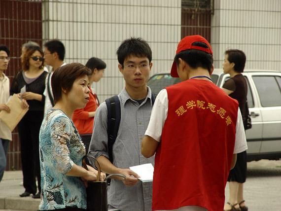 志愿者服务队在迎接新生的到来。