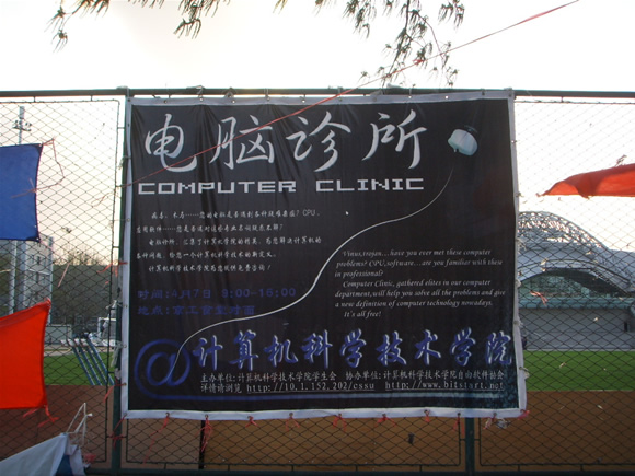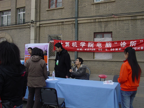 2007年4月7日上午九点,计算机科学技术学院网络部举办的电脑诊所活动在京工对面拉开了帷幕。计算机科学技术学院学生会组织了本次活动。
