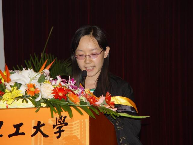 2001级王昭松同学代表全体毕业生发表了毕业感言,“回顾四年以来的每一个镜头,我们的心中充溢着深情和感谢。记得军训时我们头顶烈日的刻苦训练,记得辩论赛场我们睿智的唇枪舌剑,记得全校赛歌会上竭尽全力的大合唱,记得运动会上健美操的精彩表演,记得那人气最旺的三号楼自习室,记得生气蓬勃的西篮球场和那人潮滚滚的大食堂,记得期末考试前的挑灯夜读,记得圣诞狂欢时的喧嚣,记得在寒冷的冬夜里跑到操场上看流星雨的执著。……这一切的一切早已让我们的身心浸满了北京理工的颜色。”