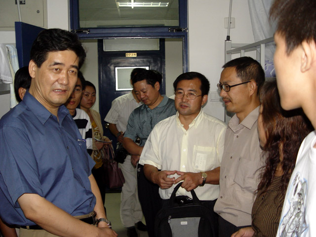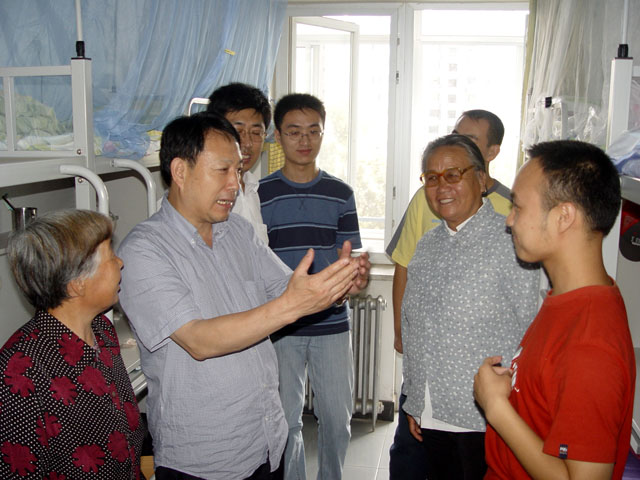 2005年9月13日,我校党政领导和相关部、处、学院领导到学生公寓看望新入学的新生。这是党委书记焦文俊、副书记侯光明到学生宿舍看望同学。