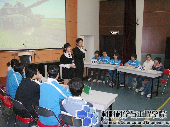 2008年3月23日下午,材料学院在良乡校区综合教学楼报告厅成功举办材料学院第二届党员理论知识竞赛。院学生会副主席沈久臻、分团委副书记韩旭和良乡校区学生会部门负责人出席了本次比赛,学院07级各班派出代表队参加了本次比赛,07级全体同学作为亲友团到场为本班代表队加油助威。在热烈的掌声中,获胜班级为大家献上了一首温馨的《相亲相爱一家人》。