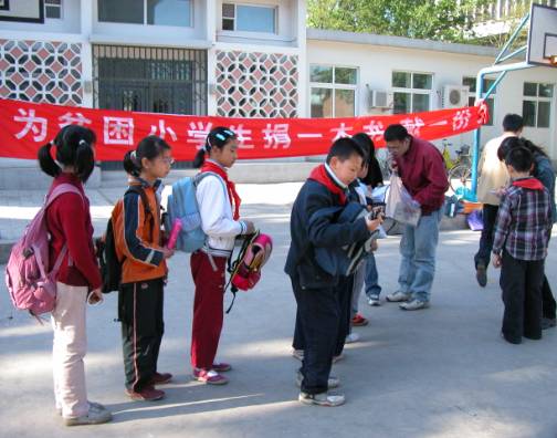 在班级里,无论党员还是群众,同学们也在积极地做着奉献:一位来自香港的女同学联系了紫光画院,为孩子们捐献了书包,文具盒;一位男同学捐赠了成套的英语学习磁带,还有实用美观的笔记本;也有的党员为孩子们购买了钢笔;很多党员为孩子们献上了成套的名著、寓教于乐的童话、漫画等书;……也有的党员和同学用实际行动表达着自己的爱心:我们这学期的课程非常的紧张,而且男生全部住在大运村,为了募捐活动,又为了不耽误课程,同学们早上7:00就要赶到募捐现场,中午下了课就赶到自己的岗位上去,连饭也顾不上吃;有的同学感冒了也在突来的大风中坚持;发送倡议书的时候一次被拒绝再来第二次,有的时候一份倡议书要发送五六次才能发送出去……