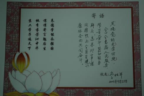 金秋时节,迎来了母校65周年诞辰。25日上午机械专业的老校友们在3#教学楼110室欢聚一堂,有解放前工专的老前辈、老革命,也有五十年代毕业的老一代知识分子;集体聚会的有63、65、72级的同学,前后签到的校友近百人。3号楼110室、112室、115室以及121室沉浸在欢庆、热烈、喜悦的气氛中,新老校友畅谈感受,不忘母校培育之恩,共祝母校繁荣昌盛,蒸蒸日上。中午就餐时,今天机械与车辆工程学院机械制造及自动化系主任张之敬教授向大家介绍了教学、科研及学科建设基本情况,感谢历届校友们的支持和关心,并代表全系师生表达了为把机械制造及自动化系办得更好而不懈努力的决心。著名切削技术专家于启勋教授、校友--73722班班长宋光威研究员等激动地谈了自己对学校、学院和机械制造及自动化系的希望和祝愿。不少校友在寄语簿上留下了殷切的寄语。有一位校友写道:“献身国防,终生不悔,后来者努力呀!”