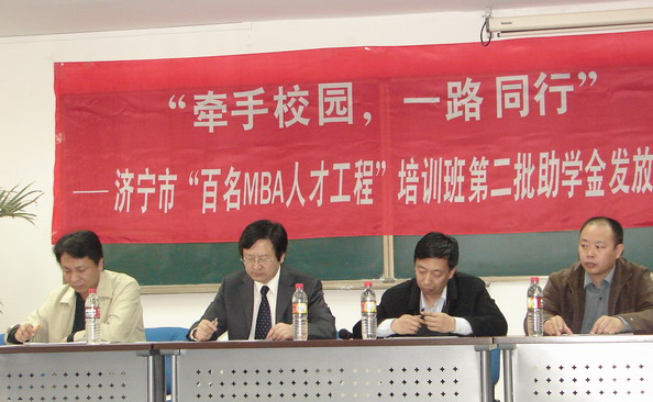 “牵手校园,一路同行”帮扶特困生助学活动是2005年8月,由山东省济宁市“百名MBA人才工程”培训班组织开展的。该培训班同学本身不富裕,有的甚至还比较困难,但为帮助在校特困生努力克服困难,安心完成学业,在班级党支部和班委会的号召下,全班同学全部积极自愿参加活动,首批捐款达12000多元,平均每人200多元,并于2005年11月1日发放了第一批助学金。这项助学活动启动后,济宁市“百名MBA人才工程”培训班学员分别与受助学生结成了“帮扶对子”,他们都主动与受助学生分别进行了聚餐、联谊、座谈等活动,有的还向受助学生赠送了礼物。春节放假前,学员代表又组织向每位特困生赠送了一套保暖内衣,使特困生带着“温暖”回家过年,加强了与受助学生的情感沟通与交流。
