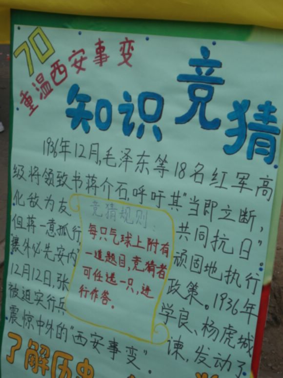 12月12日,为了增强同学们对西安事变的了解,并且在事件爆发七十周年之际,弘扬爱国主义精神,激发理工学子的爱国热情,在全国各地纷纷展开纪念西安事变七十周年活动的同时,我校管理与经济学院学生会也组织了纪念活动,在京工餐厅对面组织一次别具特色的西安事变有奖知识竞猜活动。