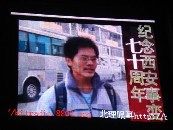除了通过知识竞猜的方式宣传西安事变,活动工作人员还联系了校信息楼大屏幕管理人员。12日当日晚上6时许,信息楼大屏幕上播放了有关纪念西安事变七十周年的纪录片和工作人员在学校内的采访录像。大屏幕上播放的内容立刻引起了路过同学的注意,同学们纷纷驻足观看,并且交流对西安事变认识和理解。