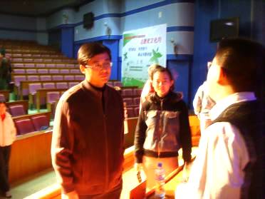讲座结束后,董兆波老师饶有兴趣地和王恺处长讨论起了大学生奥运志愿者方面的问题。