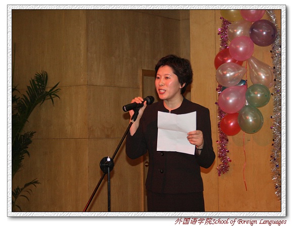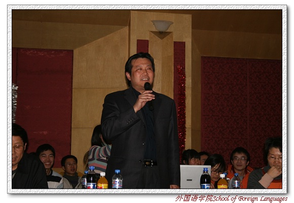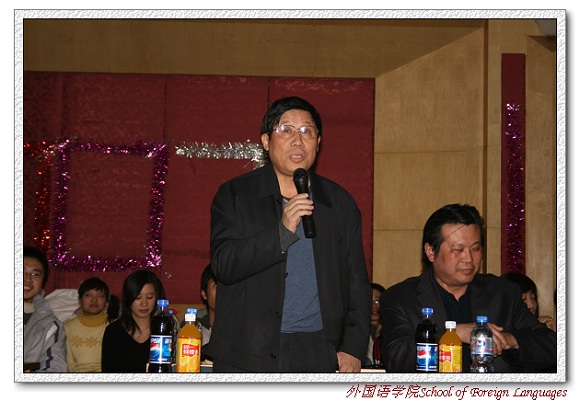 外国语学院副书记、副院长吴文君老师赞扬了此次忘年会准备的充分,希望老师同学们在辞旧迎新的时刻玩的开心尽兴,并祝愿同学们在新的一年中好好学习,天天向上。