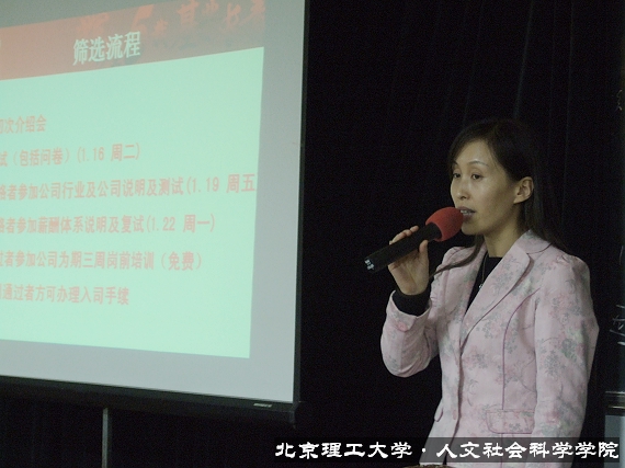 2007年1月11日下午4:30,太平人寿保险有限公司北京分公司创业说明会在1号教学楼110教室举行。此次创业说明会由人文学院ob真人竞猜办公室承办,太平人寿保险有限公司北京分公司的金牌讲师颜丙祥先生,业务经理刘依群女士、韩素芳女士和李晨先生做宣讲报告,学院分团委书记谢尔曼老师、2003级辅导员贾效明老师出席,2007届毕业生参加了此次创业说明会。