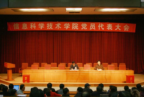 信息科学技术学院党员代表大会于2007年3月26日中午在中心教学楼一层报告厅召开,出席了本次会议的有信息科学技术学院党委书记薛唯老师、院长仲顺安老师、常务副书记张笈老师、常务副院长王军政老师、副院长汪渤老师、副院长赵长明、副院长安建平老师、副书记副院长郝群老师、副处级组织员郑重老师。