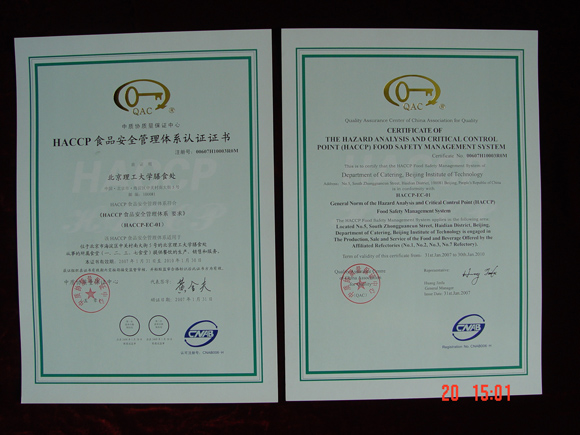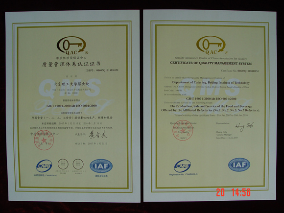 专家组对膳食处贯彻执行ISO9001质量管理体系及ISO22000食品安全管理体系的情况给与了高度评价和充分的肯定,顺利通过审核验收,同时对膳食处领导及全体员工的工作给与了积极的评价。2007年1月31日获得中质协颁发的认证资格证书。