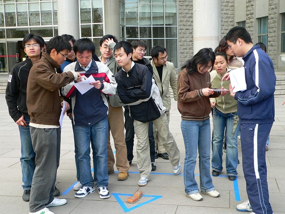 本次比赛在教学区内设立了15个点签处,42名研究生报名参加了比赛。比赛当天风力较大,这给参赛选手寻找目标点带来不少困难。比赛进行得十分激烈,当选手们在远处看到目标点的标志时,为了争取时间,都选择了直线路程,甚至跨越过障碍物,以期能比对手占有更大的优势。从这一点看来,这次“迷你”型的定向越野比赛倒真是有了几分“职业越野赛”的气氛。由于较高的气温和大量的运动,各位选手在比赛中都脸色通红汗流浃背,甚至有选手因为跨越障碍而受轻伤,但这并没有影响选手们渴望胜利的心情。