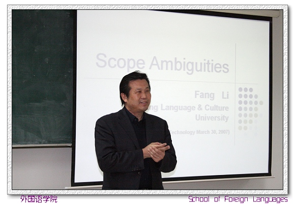 为了加强学生第二课堂教育,增进学生的英语水平,外国语学院邀请了北京语言大学外国语学院方立教授举办了一场名为“辖域歧义”的学术报告。