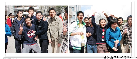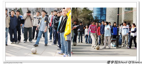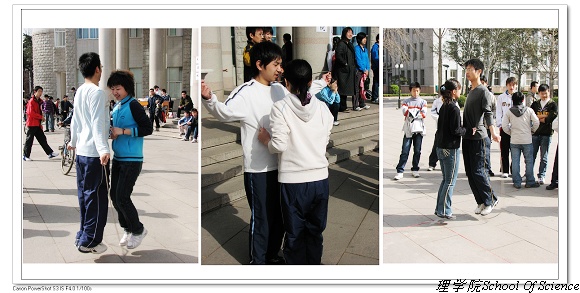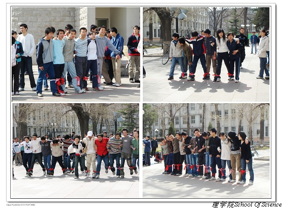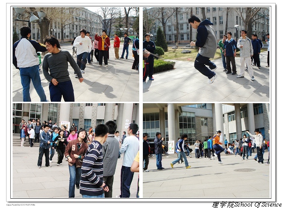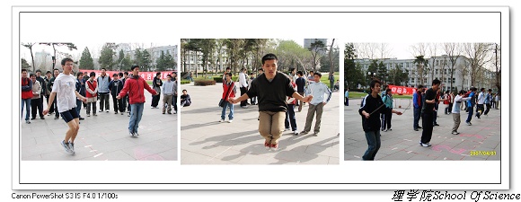 2007年4月1日上午八点,理学院本科生趣味运动会在中心教学楼东门广场举行。春寒料峭,挡不住同学们参与的热情,迎着朝阳,理学院学生会的同学们开始了紧张的赛场布置。本届趣味运动会设有单摇、双摇、一带一、跳大绳、足球射门、三人传毽、六人七足、自行车慢骑、投篮等深受同学们喜爱的项目。趣味运动会虽然以娱乐为主旋律,但其竞技性却丝毫没有减弱。