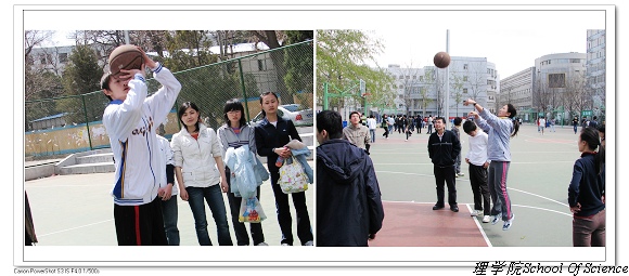 篮球是最受大学生欢迎的运动。每一次中的总能赢得同学们的阵阵喝彩,即使偏出,同学们也毫不吝啬的想起鼓励的掌声。瞄准,投篮。篮球在天空划出一道美丽的弧线。