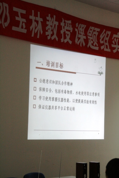 邓玉林教授在培训会上讲话,强调规章制度的培训的重要性,要在课题组中、实验室里“强化安全、例行节约,树正气、营和谐”。要求同学们特别是研究生同学要加强“自我管理、自我监督、自我服务、自我教育”,强化计划与过程化管理,有效地利用好研究生学习实验阶段的宝贵时间和实验室提供的良好条件,发奋学习、刻苦钻研、善于发现、勇于创新,为个人的成长、成才、成功打下扎实的基础。