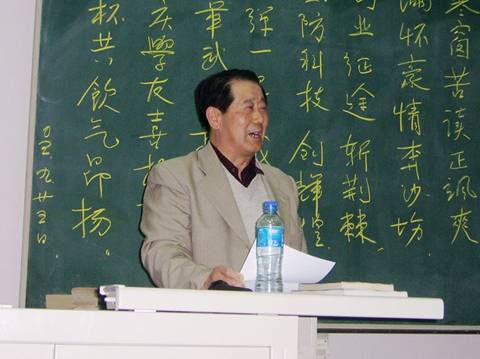 报告开始前,张教授满怀豪情的在黑板上写下并朗诵了《七律•学友聚会述怀》,以此来表达自己和学友对国防事业的热爱并激励同学们投身国防,为国防事业做贡献。