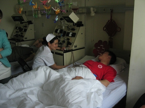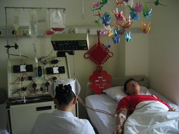 在北京市道培医院进行造血干细胞采集的造血干细胞全部是送往境外救助白血病患者的。据了解,此次捐献造血干细胞的志愿者来自河南省并在北京工作,他在几年前的一次义务献血时留下了自己的造血干细胞血样。他的血样被采集后将送往香港。气氛温馨的病房中挂着色彩鲜艳的千纸鹤和中国结,捐献者在护士、父亲和妹妹的陪伴下,心境显得十分平和。