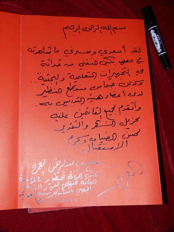 沙特技术教育及职业培训总署副署长萨利赫.本.阿布杜.拉赫曼.阿姆鲁先生为我继续教育暨现代远程教育学院题字留念。萨利赫.本.阿布杜.拉赫曼.阿姆鲁先生对于ob真人竞猜继续教育事业的发展感到非常的惊讶,并且预祝ob真人竞猜继续教育事业更加辉煌。