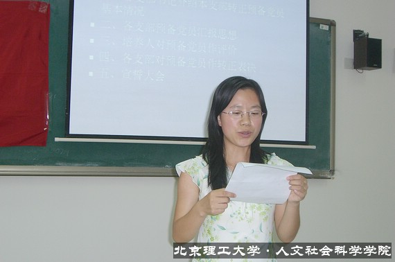 大会的气氛庄严并且热烈。大会第一项,来自人文学院06级科技哲学支部、法理学支部和心理学支部的4名预备党员向大会汇报了一年预备期里自己思想觉悟提高情况。接着,法理学党支部的张江洲同学等作为4名预备党员的介绍人向大家介绍了支部对4名预备党员的考察和培养情况。