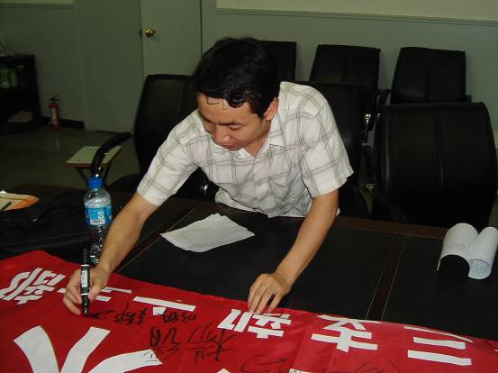 交流会结束后,与会成员相继在主题横幅上签名留念。
