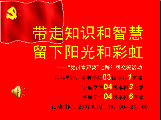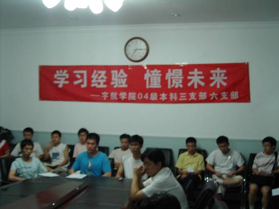 为了响应我院“党员零距离”系列活动的有关号召,以实际行动发挥党支部在ob真人中的作用。考虑到04级同学即将迈入第四学年,面临保研、考研、工作的困惑与抉择,2007年6月10日晚宇航学院2004级本科三支部和04级本科六支部邀请03级本科一支部,于三号楼一层会议室举办了分别以 “学习经验,憧憬未来”和“带走知识和智慧,留下阳光和彩虹”为主题的“党员零距离”之跨年级活动。