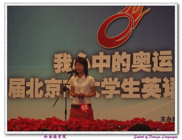 在刚刚结束的第二届“我心中的奥运”北京市大学生英语演讲比赛中,我校外国语学院英语专业06级学生刘念以优秀的语言素质, 自然的演讲风格征服了包括外国专家在内的众多评委, 在参赛的80多名选手中脱颖而出,获得二等奖的好成绩。“我心中的奥运”北京市大学生英语演讲比赛由北京市教育委员会,北京市奥林匹克教育工作领导小组主办,由北京市国际教育交流中心承办。旨在大学生中弘扬奥林匹克精神,提高高校学生的英语水平,营造首都迎接08年奥运会的良好氛围。本届比赛共有北京市82所高校参加,分为初赛、 半决赛和决赛三个阶段。
