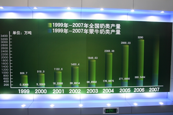 蒙牛的奶产量逐年递增,占全国的比例也不断增加,去年奶产量达到400万吨。蒙牛立志把内蒙古打造成世界乳都。