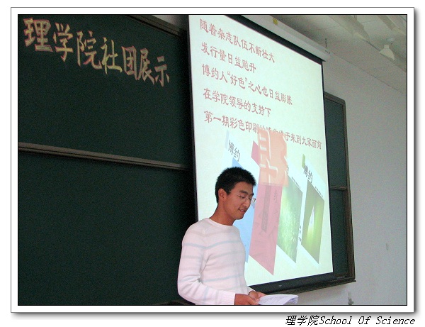 接下来,《博约》杂志社以“《博约》诞生记”拉开了他们风采展示的帷幕,恰如其分的图片配以幽默诙谐的解说使会场气氛热闹活跃。博,宇宙之大,万物之理,以至人生广袤;约,端枝末节,世界之微,而及生活琐碎。细微两字,道出世间真谛,也道出了《博约》二字的含义。《博约》存在的意义,就是“自由之思想,独立之精神”这历经世代而弥新的经典准则。