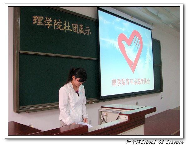 校“十佳社团”——理学院青年志愿者协会的ppt展示则诠释了协会“奉献、友爱、互助、进步”的志愿精神和“以弘扬新风正气,改善人际关系、培养青年的奉献精神和服务能力,促进青年的健康成长”为己任的理念,他们“挽起我们的衣袖,扬起那份永恒的爱”的口号使会场中洋溢着浓浓的温情……