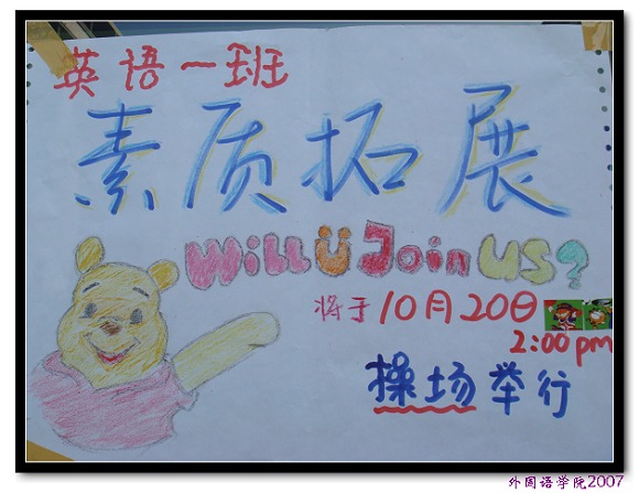 值得一提的是,负责组织这次素质拓展训练的均是2007级外国语学院的新生同学们,12个小姑娘用高度的责任心和细致的准备,为此次素质拓展活动的顺利进行作出了很大的贡献。