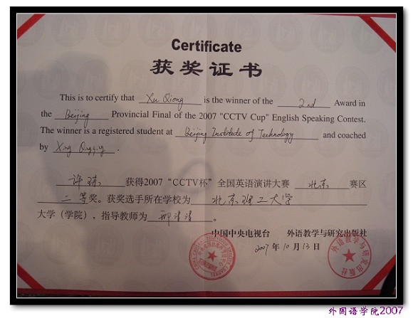 在刚刚结束的2007年“CCTV杯”全国英语演讲比赛北京地区复赛中,我校外国语学院英语专业13110602班的许琼同学荣获二等奖。