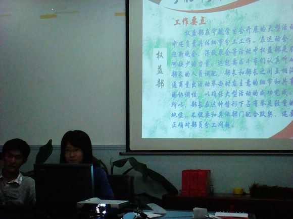 之后,分管各部的主席团成员又向我们介绍了各部的具体活动流程。从活动的计划、实施、总结到应注意的问题每个步骤都进行了详细的讲解,并提醒我们要注意活动的细节问题。这使我们对活动的开展有了一个整体的了解。