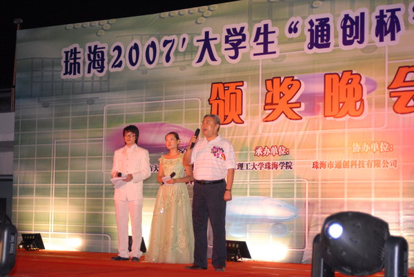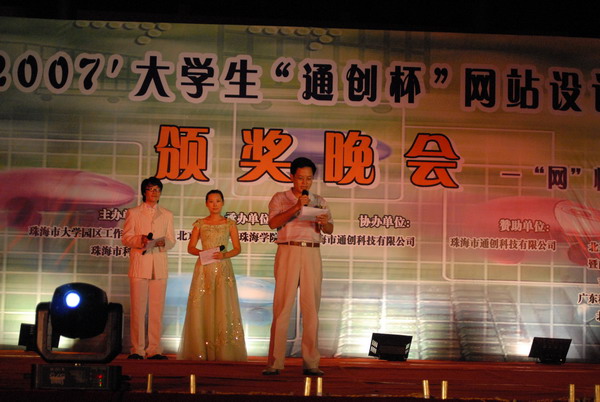 2007年10月27日晚,鲜花、气球、彩带把ob真人竞猜珠海学院运动场装扮得热闹非凡,由珠海市大学园区工作委员会、珠海市科技局主办,ob真人竞猜珠海学院承办,珠海市通创电子科技有限公司协办的“珠海2007ˊ大学生‘通创杯’网站设计大赛”颁奖晚会在这里盛大举行,中共珠海市大学园区工作委员会书记、珠海市大学园区工作委员会主任钟国胜、珠海市科技局局长邱轼、珠海学院院长董兆钧、珠海市软件行业协会秘书长岳乃正、珠海市高新技术创业服务中心主任阎武等领导和嘉宾以及来自各高校的3000多名学生参加了晚会。
