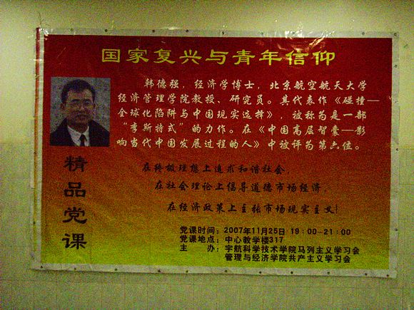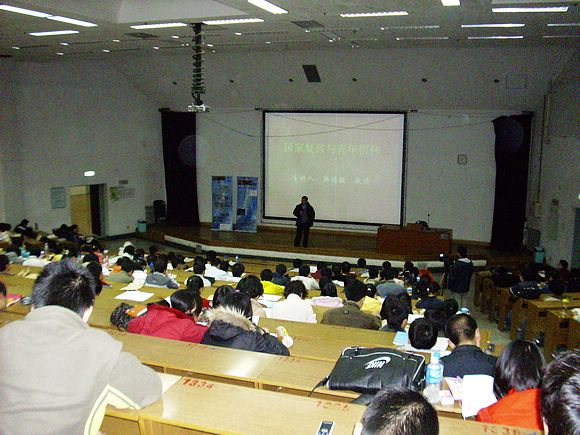 这次党课活动邀请到了北航经济管理学院的韩德强教授,他为我们做了《国家复兴与青年信仰》的讲座。他主要谈了在经济全球化的潮流下,我国面临诸多的挑战,我们应该树立为人民服务的信仰。